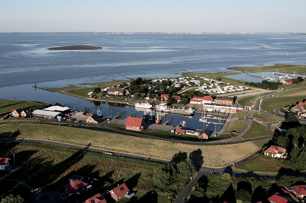 Vom Hafen aus kannst du auch den Langwarder Groden besuchen oder an der Kunstpromenade entlang Richtung Burhave spazieren gehen. Wenn der Tag sich dem Ende zuneigt, gönn dir einen Sundowner in der Bar „Achterdeck“ – direkt am Wasser, mit bestem Blick aufs Abendlicht.