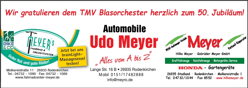 Kontinuität ist überhaupt ein besonderes Merkmal der TMV Rodenkirchen. In der jetzt 50-jährigen Vereinsgeschichte gab es nach Lübbe Abbenseth mit Mitbegründer Wilfried Müchler, Thorben Klein und jetzt Björn Meyer bislang nur drei weitere Vorsitzende. Neben Müchler und Peter Abbenseth sind mit Marion Cramer, Ute Redecker und Birthe Oellrich noch drei weitere Mitbegründerinnen große Stützen des Ensembles.
