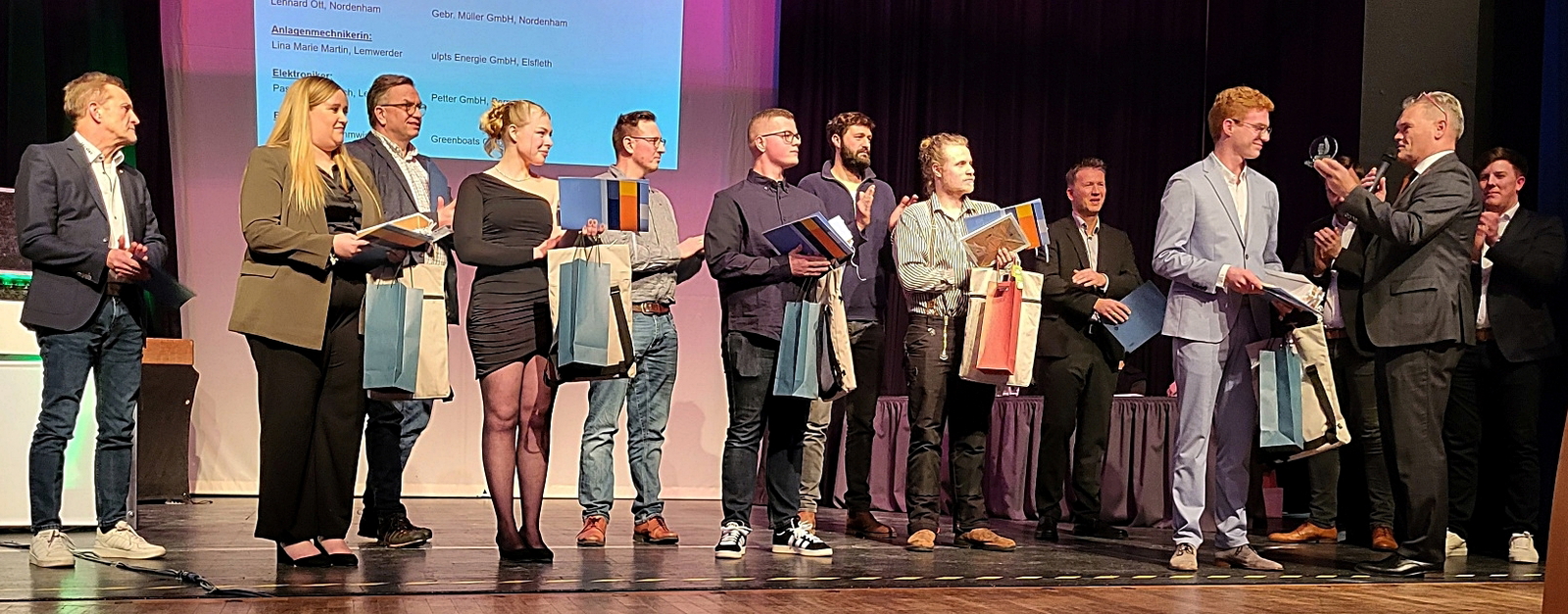 Die Gesellenbriefe überreichten die Innungs-Obermeister Jens Krummacker (Sanitär und Heizung), Henning Sommer (Bauhandwerk), Hans Stützle (Bootsbauer), Jens Thormählen (Dachdecker), André Kuhlmann (Elektro) und Walter Tapken (Metall) sowie der stellvertretende Obermeister Stefan Gäting (Dachdecker) und Prüfungsausschuss-Vorsitzender Wolf Teggemann (Kfz-Handwerk) den erfolgreichen Absolventen.